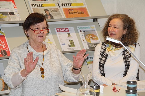 Das gesprochene Wort in Verbindung mit der Körpersprache: Auch beim Lesen und Erzählen bleibt Hannelore Fischer Knuth Schauspielerin. Rechts neben ihr Moderatorin Marie-Helen Lüchinger.