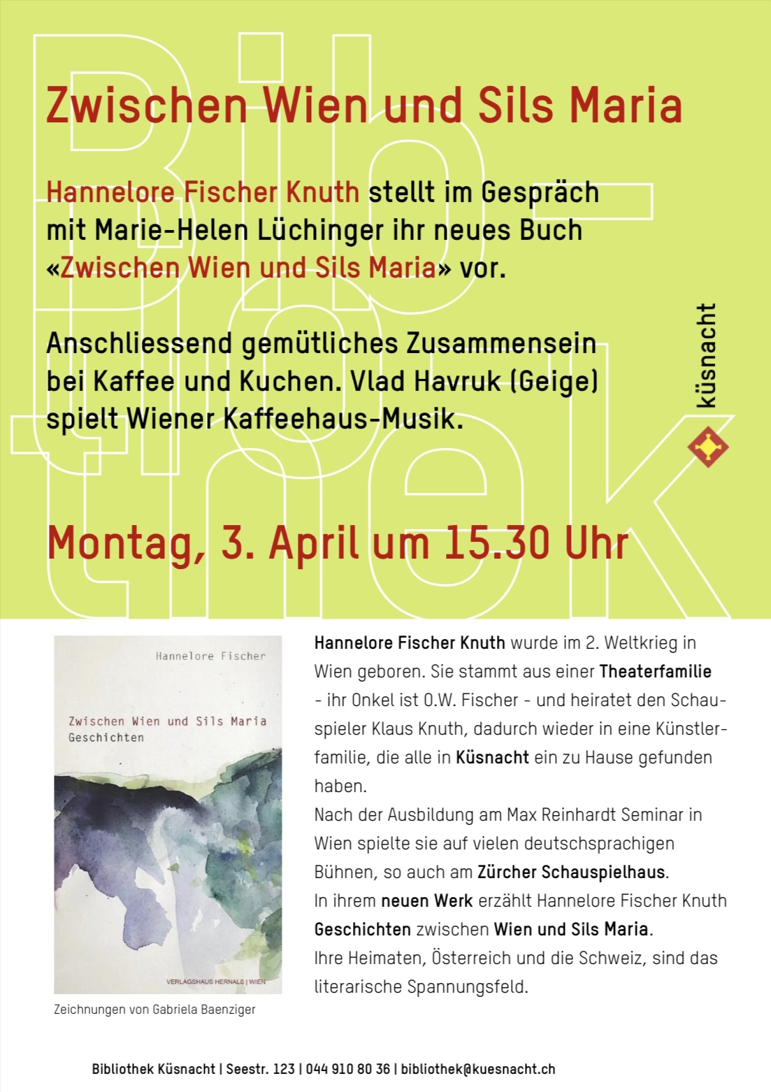 Hannelore Fischer Knuth stellt im Gespräch mit Marie-Helen Lüchinger ihr neues Buch «Zwischen Wien und Sils Maria» vor. Anschliessend gemütliches Zusammensein bei Kaffee und Kuchen. Vlad Havruk (Geige) spielt Wiener Kaffeehaus-Musik. Hannelore Fischer Knuth wurde im 2. Weltkrieg in Wien geboren. Sie stammt aus einer Theaterfamilie – ihr Onkel ist O.W. Fischer – und heiratet den Schauspieler Klaus Knuth, dadurch wieder in einer Künstlerfamilie, die alle in Küsnacht ein zu Hause gefunden haben. Nach der Ausbildung am Max Reinhardt Seminar in Wien spielte sie auf vielen deutschsprachigen Bühnen, so auch am Zürcher Schauspielhaus. In ihrem neuen Werk erzählt Hannelore Fischer Knuth Geschichten zwischen Wien und Sils Maria. Ihre Heimaten, Österreich und die Schweiz, sind das literarische Spannungsfeld. Veranstaltungsort Bibliothek Küsnacht Seestrasse 123 8700 Küsnacht