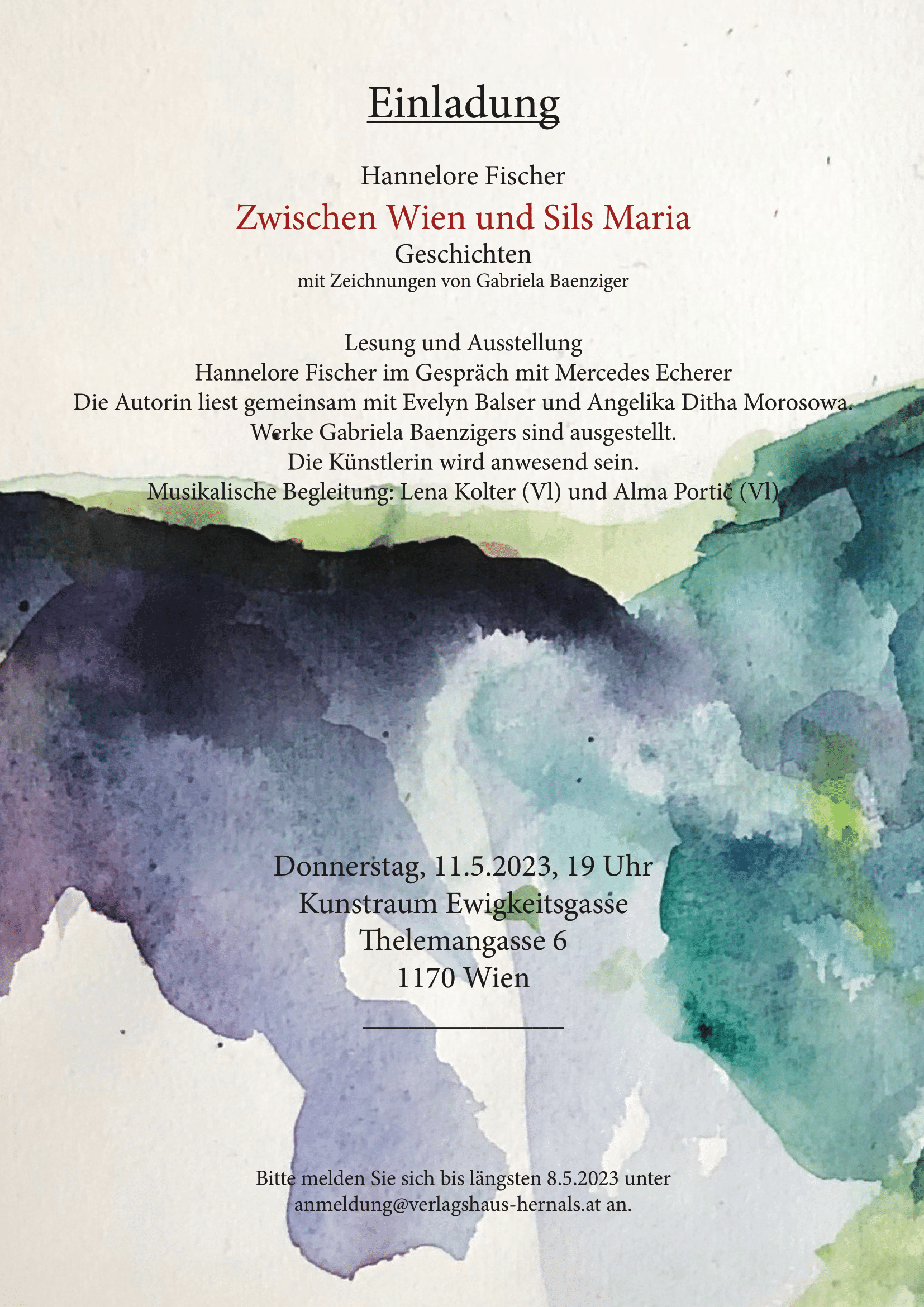 Lesung und Ausstellung Hannelore Fischer im Gespräch mit Mercedes Echerer Die Autorin liest gemeinsam mit Evelyn Balser und Angelika Ditha Morosowa. Werke Gabriela Baenzigers sind ausgestellt. Die Künstlerin wird anwesend sein. Musikalische Begleitung: Lena Kolter (Vl) und Alma Portič (Vl) Donnerstag, 11.5.2023, 19 Uhr Kunstraum Ewigkeitsgasse Thelemangasse 6 1170 Wien _____________ Bitte melden Sie sich bis längsten 8.5.2023 unter anmeldung@verlagshaus-hernals.at an.